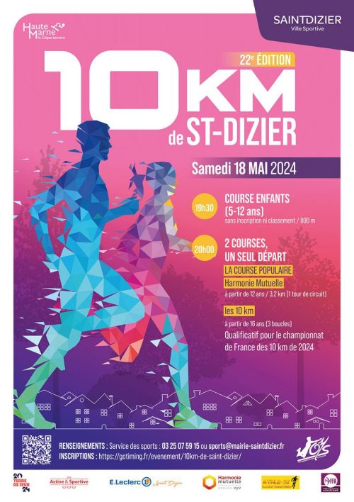 Pour cette édition qui se déroulera en semi-nocturne, dans les rues du centre-ville, l’épreuve des « 10 km de Saint-Dizier » devrait, une fois encore, rassembler sportifs et public venus en nombre. Riche en animations, la manifestation des « 10 Km de Saint-Dizier » est l’un des temps fort de la cité bragarde.