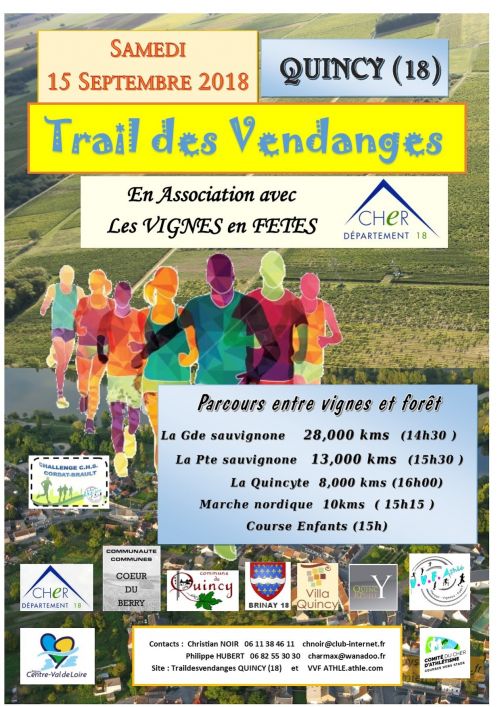 Le Trail des vendanges est organisé par le club VVF ATHLE, les communes de QUINCY, BRINAY, PREUILLY, CERBOIS et les associations de Quincy. Le Trail des vendanges est un évènement sportif proposant trois épreuves de course et une marche nordique de pleine nature entre les villages de Quincy, Brinay, Preuilly traversant les vignobles et la forêt.