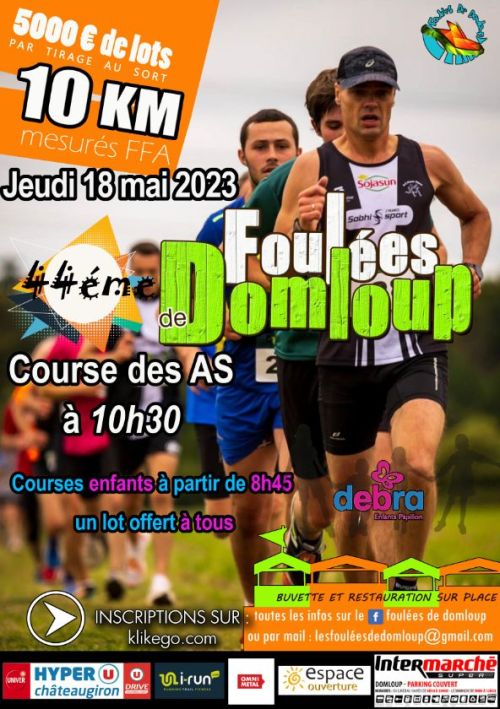Foulées de Domloup. Le départ de la Course des As sera donné à 10H30. Le parcours avec de nombreuses relances, emprunte les chemins pédestres de Domloup ainsi que la Vallée du Rimon (50% Chemin 50% Route).