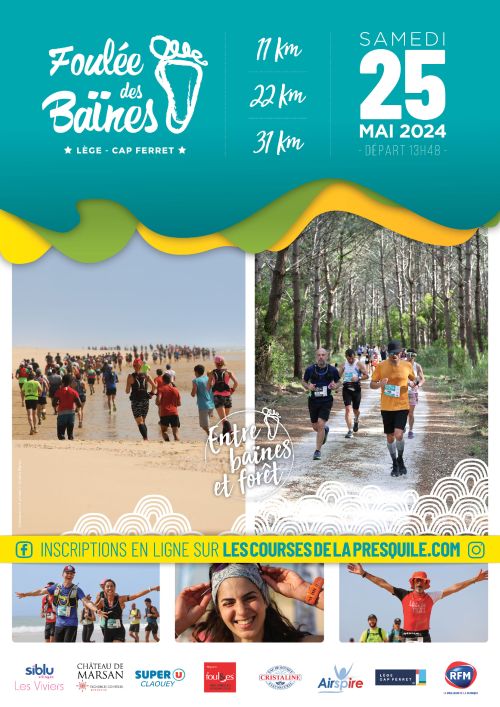 La Foulée des BaÏnes c'est 50 % sable - 50 % Forêt. Départ à 30 minutes de la marée Basse avec un seul ravitaillement à mi-parcours. Tour de cou et bouteille de vin à tous les inscrits.