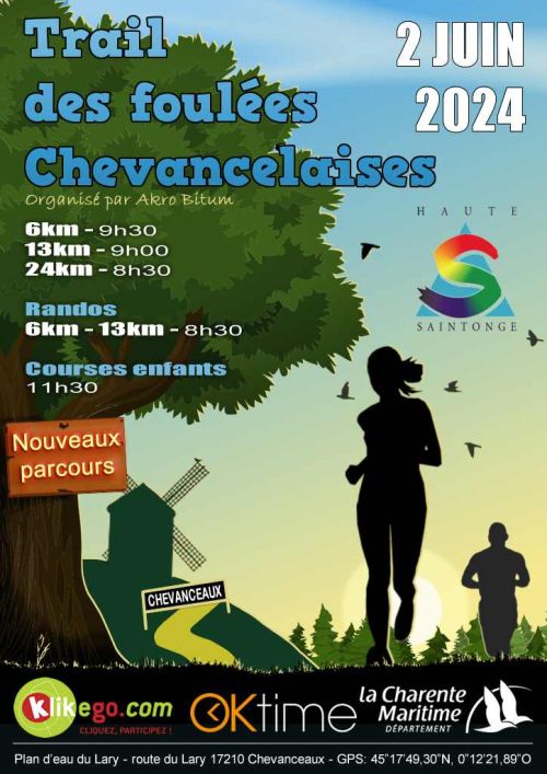 «Trail proposant 3 parcours de 6, 13 ou 24 km plus ou moins accidenté, dans un cadre empruntant chemins et sentiers boisés sur la commune de Chevanceaux (17210). Les marcheurs ne sont pas oubliés avec une randonnée de 6 ou 13km sur les traces des coureurs. De même, les enfants ont la possibilité de participer à une course, en ville, adaptée à leur catégorie d’âge.»