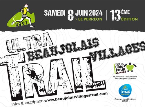 L'association Ultra Beaujolais Villages Trail vous accueille au cœur du Beaujolais dans le petit village du Perréon. 5 épreuves pour satisfaire le plus grand nombre, de 7 à 77 ans, de 500m jusqu'à 80 km ! Les parcours vous entraîneront à travers vignobles, crêtes, forêts, landes et villages pittoresques du Beaujolais sur une grande variété de chemins. De superbes panoramas s'offriront sans cesse aux coureurs et une soirée festive en musique autour d'un repas local viendra clore la journée !