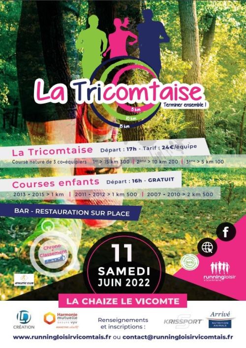 La Tricomtaise est une course par équipes de 3 coureurs se déroulant sur un circuit de 5 km alliant route et chemin. L’équipier n°1 prend seul le départ pour 3 tours de circuit, se fait accompagner par l’équipier n°2 à l’entame du 2 ème tour, puis par l’équipier n°3 à l’entame du 3 ème tour. A l’issue du 3 ème tour, les 3 équipiers passent obligatoirement la ligne d’arrivée ensemble, main dans la main. L’équipier n°1 parcours 15 km, l’équipier n°2 parcours 10 km, l’équipier n°3 parcours 5 km