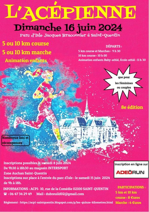 l'ACPI organisera au Parc d'Isle de Saint-Quentin un "5 et un 10 kilomètres" destinés aux femmes avec possibilité de courir en couple. Deux courses, deux marches organisées par les ACPIens ! Mesdames, mesdemoiselles, réservez d'ores et déjà cette date dans votre agenda sportif.