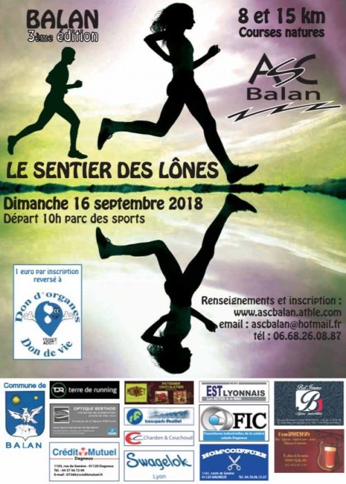 Second parcours de 8 kilomètres et accessible à un plus grand nombre de coureurs. L’autre parcours de 15 kilomètres ayant attiré 150 participants en 2017. Départ commun du Parc des Sports, pour les 2 distances à 10 heures. Et d’autre part, cette année, l’ASC Balan est partenaire de l’association FRANCE ADOT 01 et lui reversera 1 € par inscription en faveur du don d’organes et de tissus humains.