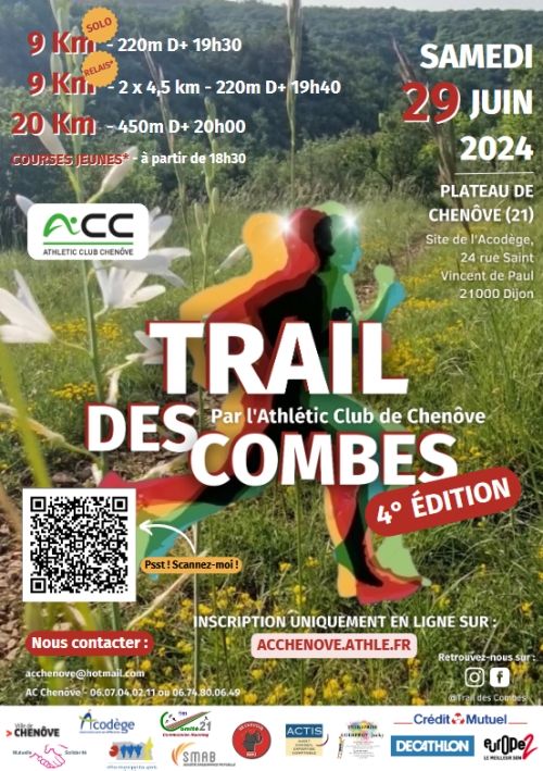 L'Athlétic Club Chenôve organise le Trail des Combes. Au programme, 3 courses adultes (9km, 2x4,5km et 20km) et 2 courses jeunes (distances selon les catégories d'âge).