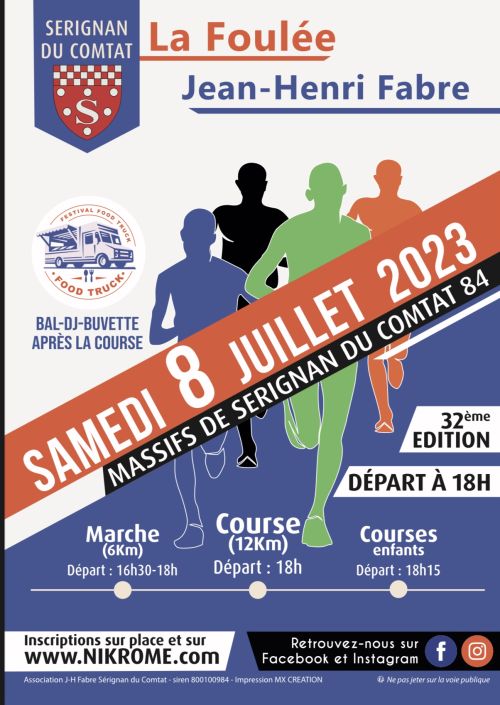 Course Nature de 12 km dans les Massifs de Sérignan du Comtat 84 Départ à 18 h00dans le village, puis monotraces avec un retour et arrivée dans le parc Ribadeau. Marche de 6 km et course enfants . a l'issue de l'évènement un apéro ainsi que Food Trucks et DJ dans le Parc pour finir la soirée .