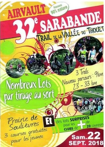 Parcours tracé dans la vallée du Thouet, chemins, sentiers, bois, champs, coteaux avec traversées du Thouet sur des passerelles et chaussée. Parcours vallonné. Le Trail de la vallée du Thouet La Sarabande Airvaudaise aura lieu avec 3 trails de 9 km, 23 km et 33 km. Départ et arrivée dans la prairie de Soulièvres. Nouveau parcours pour le 9 km: plus facile.