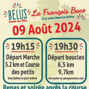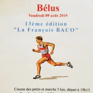 Dans cette course de route, il y en a pour tous les goûts en terme de relief, car elle comporte des parties roulantes, mais aussi du dénivelé. Cependant, elle reste accessible à tout le monde. Vous y serez reçu avec le meilleur accueil, et chaque participants recevra un souvenir du terroir. "La François Baco" s'inscrit dans le cadre des fêtes de Bélus et cette épreuve ouvrira les festivités.