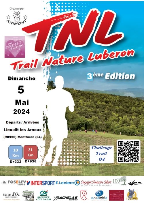 Trail 21 km - Challenge TRAIL 04. départ 8h45 TRAIL de 21 km et environ 936 m de dénivelé positif pour les coureurs avertis car le circuit est exigeant (nombreuses relances et ascension raides) Beaucoup de dénivelé, certes, mais surtout un tracé essentiellement sur des sentiers. Venez profitez d’un dimanche sportif, familial et chaleureux, sur les magnifiques terres du Luberon. Départs / Arrivées : Lieu-dit les Arnoux, RD956 à Montfuron. GPS 43.839001, 5.673650. Partenariat avec l'association Un coeur d'ange, au profit des enfants malades : 1€ reversé à l'association pour chaque participant inscrit