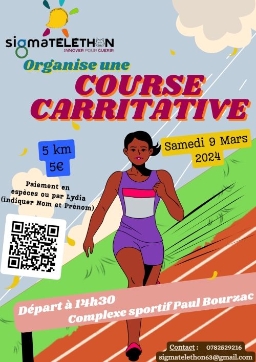 Course nature de 5 km à Aubière (63170, France). Départ à 14h30 au complexe sportif Paul Bourzac. Il n'y a pas de classement ni de chronomètre, ici on accepte tout le monde, ceux qu'ils veulent sprinter et ceux qui préfèrent marcher tranquillement. Le prix est de 5€ est l'intégralité de l'argent collecté ira à l'ADM Téléthon.