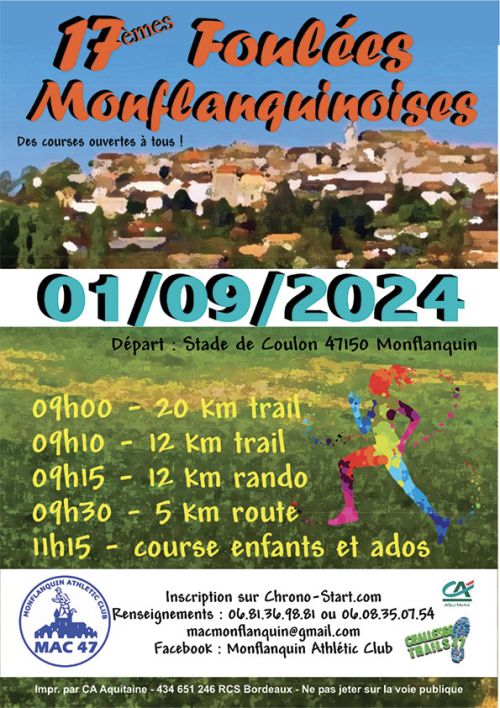 Epreuve faisant partie du challenge des trails du 47. Plusieurs ravitaillement sur le parcours et à l'arrivée, casse-croute offert - Course retransmise en direct par Quad Evasion 47 sur le site de la plaine des sports, récompenses aux 3 premiers scratch