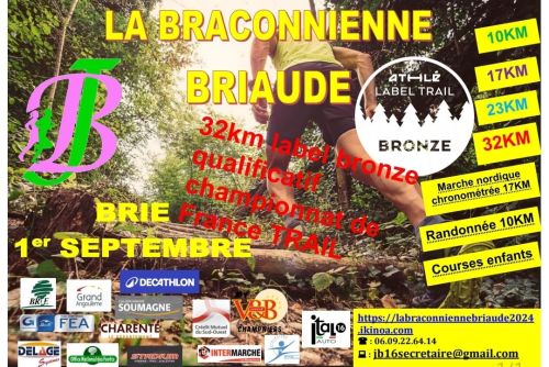 La Braconnienne Briaude. Comme l'an passé, lieu de départ/arrivée depuis La Vallée de Brie, au pied du bourg de la commune de BRIE. Cherchez l'Eglise et vous êtes presque arrivés. Cette année, nous changeons les parcours ET les distances. Nous vous proposons un 10km qui serpente aux alentours de notre village. Nos autres tracés, 17km (solo, duo et marche nordique), 23km et le 32km, avec un label Régional, quand à eux rejoignent la forêt de la Braconne 95% de chemins et monotraces.