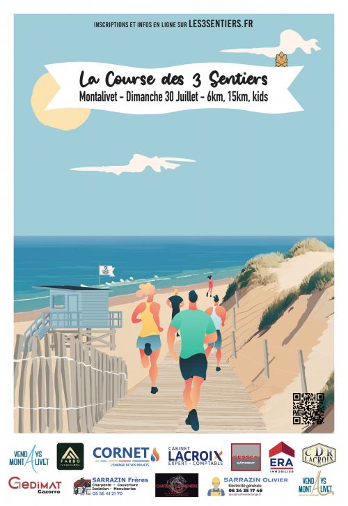 La course des 3 sentiers a lieu à Montalivet, c’est un évènement de course à pied convivial qui propose aux participants plusieurs formats pour que chacun y trouve son compte et prenne un maximum de plaisir. Nous vous proposons deux formats de course à pied, 6 km et 15 km, ainsi qu’une course kids de 1 km. Nous avons adapté les parcours pour qu’ils soient agréables et diversifiés, Plage, foret et bitume, voici donc nos 3 sentiers.