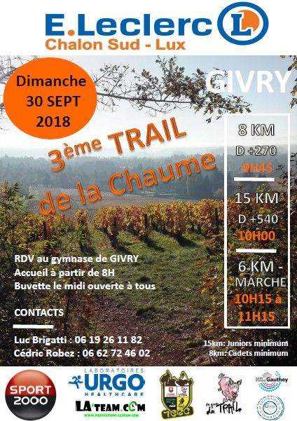 Le départ du 8km sera donné à 9h45 et celui du 15km à 10h devant le gymnase du collège. Le 15km fait partie du Trail Challenge de la Côte Chalonnaise. Le parcours du 8km reste quasiment le même. Quelques petites modifications sur le 15km avec 40m de dénivelé positif en plus (mais ces 2 courses restent dans le même sens) Nous renouvelons notre marche famille qui pourra être faite avec les enfants (environ 6 km).