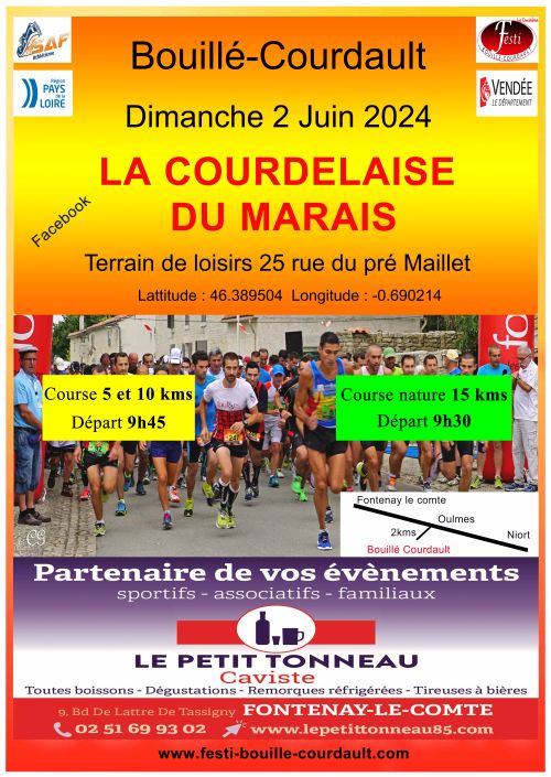 courses à pieds le dimanche 2 juin 2024 à Bouille courdault terrain de loisirs rue du pré maille 85420 Bouille Courdault 5kms 10kms et 15kms sur chemin et routes du marais poitevin 250 participants depart course 9h30 inscription: https://courdelaise-du-marais-2024.onsinscrit.com/accueil.php