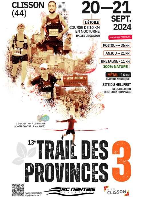 Trail des 3 Provinces. La Section Etoile de Clisson du Racing Club Nantais vous donne rendez-vous pour un départ inédit dans la Warzone sur le site du Hellfest. Trois parcours vous sont proposés : Bretagne 12 km, Anjou 21 km et Poitou 42 km. A 30 km de Nantes, Clisson renommée pour son charme à l'italienne est également depuis plus d'une décennie la capitale incontournable du Metal avec son très réputé festival du Hellfest.