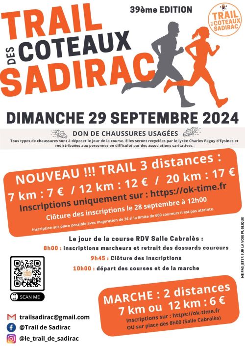 L’USS Sadirac organise le Trail des Coteaux de Sadirac à la découverte des chemins, coteaux, sentiers, vignes et sous-bois de l’entre deux mers avec deux épreuves de Trail et une marche.