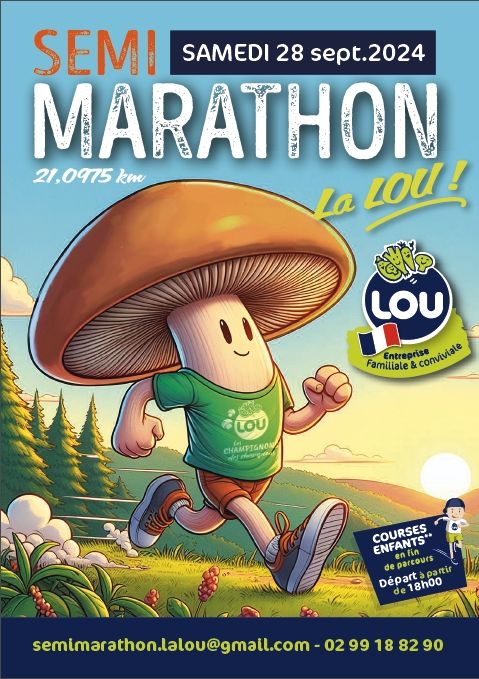 Le semi-marathon La LOU revient pour une 4ème édition le samedi 28 septembre à 16h à la champignonnière de Poilley (35). Vous traverserez les communes de Poilley, Villamée, Louvigné-du-Désert puis pour finir Landivy avant de rejoindre la champignonnière LOU. La course est ouverte à tous dans la limite des 300 participants. Chronométrée, elle vous permettra de vous surpasser !⏱ Nous organisons 3 courses (2km, 3km et 5km) pour les enfants autour de la champignonnière de Landivy. 🏃♀️ L’occasion parfaite de partager un moment sportif, en famille ou entre amis dans la bonne humeur et la convivialité ! 😊 Petit plus cette année, nous organisons un repas à base de champignons après les courses.