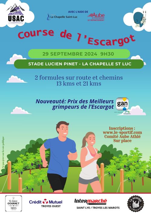 La Course de l'Escargot. Circuit entre La Chapelle St Luc et Montgueux empruntant une partie chemins et une partie route (en particulier la côte de l'Escargot (2 kms de montée en lacets sur la commune de Mongueux) et retour par cette même côte pour terminer au stade de La Chapelle St luc