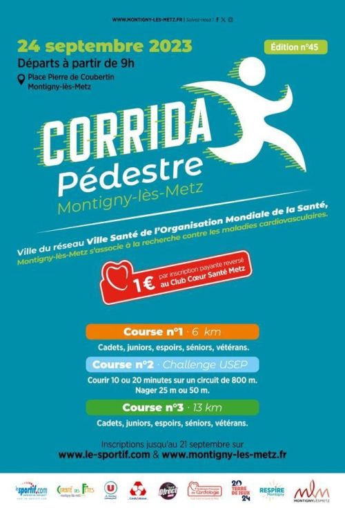 Le Comité des Fêtes et la Ville de Montigny-lès-Metz, organisent la Corrida Pédestre. Cette course est devenue un véritable rendez-vous sportif : l’année dernière, elle a réuni quelque 1200 participants, autour des valeurs saines de l’effort.