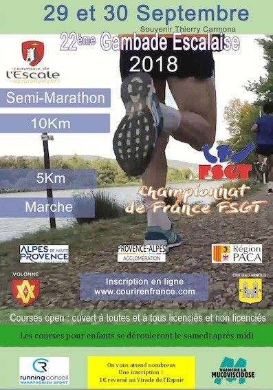 La Gambade Escalaise servira de support pour le Championnat de France de 10km et Semi-Marathon FSGT. Cette manifestation est ouverte à toutes et à tous, licencié et non licencié. Divers animations seront proposées. Nul doute que ça sera un superbe Week-End organisé par le Team Runner Déclic04.