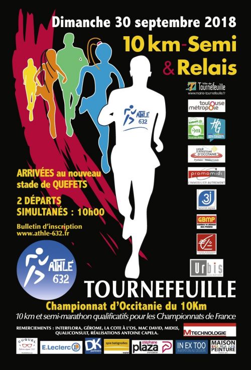ATHLE 632 organise le 10 Km, le Semi-Marathon et le Relais de TOURNEFEUILLE. Ces épreuves sont qualificatives pour les championnats de France de 10 Km et de semi-marathon. Le 10 Km constituera le championnat d’Occitanie 2018 de la discipline. Le port du maillot du club est obligatoire pour les prétendants aux titres de champions d’Occitanie dans toutes les catégories.