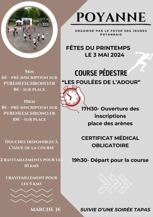 Comme chaque année, le Foyer des Jeunes et le Comité des fêtes de Poyanne organise les fêtes de printemps. Pour ce faire, le Foyer des jeunes vous invite à leur course pédestre! 🏃🏻‍♂️🌿