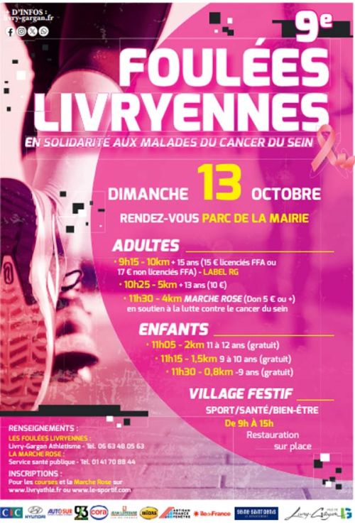 Foulées Livryennes 10 km pour les athlètes de 15 ans et plus (une partie reversés à Octobre Rose) – qualificatif pour les championnats de France