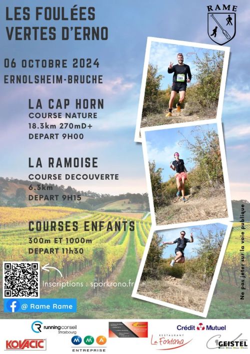 Les traditionnelles Foulées de la Bruche laissent place cette année à une épreuve totalement revue et plus exigeante: Les Foulées Vertes d'Erno. Ainsi le RAME vous propose un format plus nature avec une première course de 17 kms totalement nouvelle au nom pas si anodin, le Cap Horn.