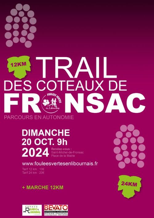 Course nature traversant les vignobles de Fronsac avec des passages dans bois et sous bois. Pour les coureurs, 2 distances sont proposées à travers chemins et sentiers : 12kms et 24 kms. Les courses seront en semi-autonomie avec plusieurs ravitaillements uniquement avec de l'eau sur la course. La possibilité est offerte aux marcheurs d'utiliser le petit parcours (12 kms) pour une randonnée libre ; les coureurs restent toutefois prioritaires.