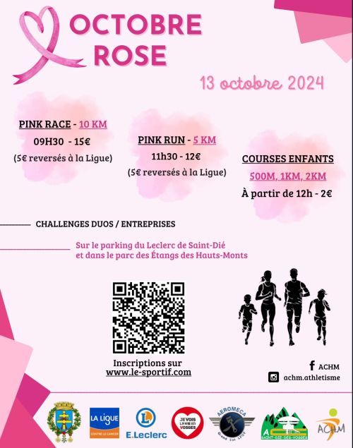 Toute nouvelle édition des foulées de Saint-Dié des Vosges. Nouveau parcours, nouveaux horaires, au coeur de la ville. Pour cette édition, l’ACHM s'accocie avec la ville de Saint-Dié des Vosges, pour organiser une grande manifestation autour d'Octobre Rose.