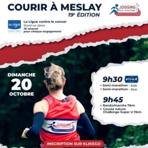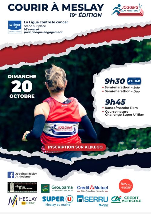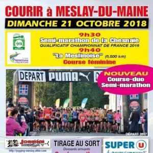 Semi-marathon de Meslay du Maine : 14ème édition, labelisé et qualificatif au championnat de France. Circuit en 3 boucles distinctes (1,500 km + 7,500 km + 12,100 km) vers les villages de St Denis du Maine et Arquenay, le tour de la base nautique de la Chesnaie et le sentier pièton en sable dur pour revenir à Meslay du Maine. Pas de difficultés majeures, faux-plat de 600m avant le 16ème km. Nouveautés possibilités de courir en DUO le semi-marathon : 9km pour le premier relayeur et 12.1km pour le second.
