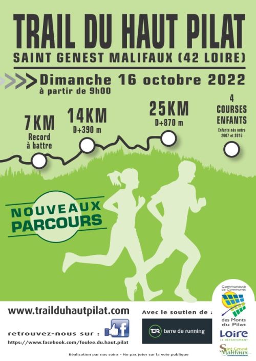 Trail du Haut Pilat en moyenne montagne à 1000m d'altitude, à 20 min de St Etienne, 35 min de Annonay et 1h de Lyon, vous accueille dans un esprit convivial à la découverte du Mont-Chaussitre et de ses alentours à Saint Genest Malifaux. Parcours 100% nature aux choix ainsi que courses enfants vous permettront de choisir votre course en fonction de vos envies.