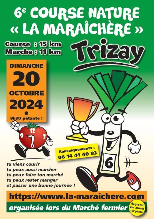 COURSE NATURE « LA MARAÎCHÈRE » à 17250 TRIZAY. Une course populaire de 15 Km ouverte à tous ceux qui n’ont pas peur de se salir les baskets • Circuit mesuré par GPS, balisé, sécurisé dans les parties difficiles ou acrobatiques, • 2 ravitaillements sur le circuit et un à l’arrivée, • Classement scratch homme/scratch femme uniquement • Un souvenir pour tous les participants