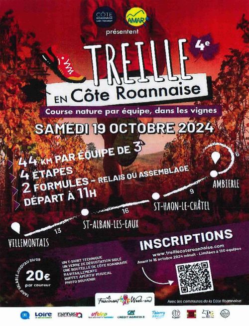 Relais par équipe de 3 sur 44km en 4 étapes dans le vignoble de la Côte Roannaise (42). Trois premières étapes en individuel (équipier 1 : 13km, puis équipier 2 : 15km, puis équipier 3 : 10km) puis étape 4 les 3 équipiers ensemble pour 6km.