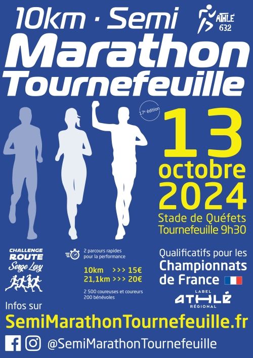 Semi-marathon & 10 km, grand rendez-vous annuel organisé par le club Athlé 632 à Tournefeuille. Qualificatifs pour les championnats de France. Départs simultanés pour chaque épreuve Boulevard Alain Savary en direction de la base de loisirs de la Ramée avec une arrivée sur la piste d'athlétisme de Quéfets.