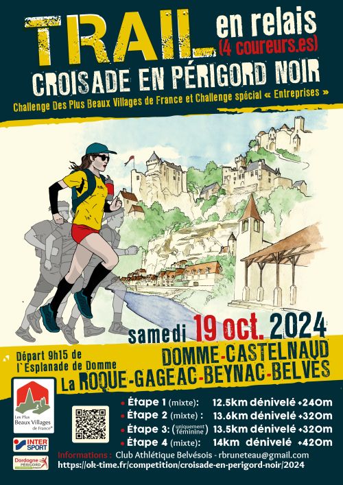 Cette course trail en relais de 4 coureurs dont au moins 1 féminine partira du village de Domme pour rejoindre celui de Belvès en passant par Castelnaud la Chapelle, La Roque, Gageac, Beynac soit les 5 plus beaux villages de France classés en Périgord Noir. 4 étapes, départ de chaque étape en ligne. Temps cumulé à l'arrivée. Cette année, l'étape 3 sera exclusivement féminine
