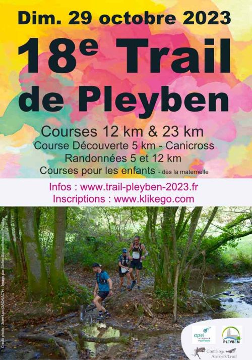 L’APEL de l’école Saint Joseph organise le traditionnel Trail de Pleyben. Le parcours vous fera découvrir la campagne pleybennoise tout au long d’un tracé mêlant les sous bois, prairies, chemins creux et passages de rivières, tous les ingrédients des amateurs des courses en nature. L’épreuve fait partie du challenge Armorik Trail dont c’est la troisième édition. La remise des récompenses du challenge aura lieu directement après les courses. 3 Distances proposées 5, 12 et 22 km au départ du gymnase Pierre Cloarec