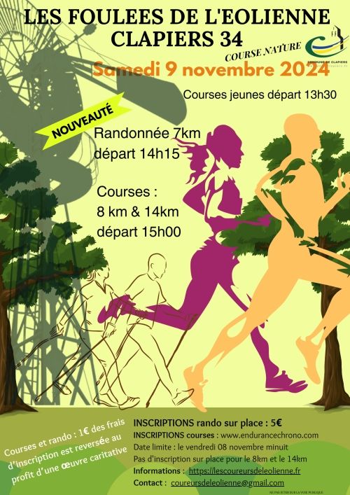 21ème édition des Foulées de l'Eolienne 2 courses : 8 KM sur de larges pistes 14 km sur des pistes et monotraces Départ commun à 15 h avenue Charles de Gaulle à Clapiers 34