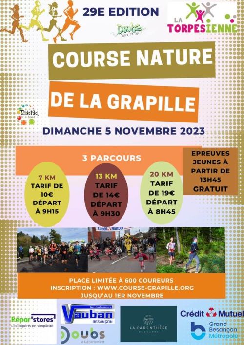 La course nature de la Grapille est une course pédestre sur sentiers et chemins balisés pour des parcours de 7 Km (course ouverte aux cadets, juniors, seniors et vétérans ; 5 km pour les minimes ) et 13 km (course ouverte aux cadets, juniors, seniors et vétérans). Courses jeunes gratuites l’après midi.