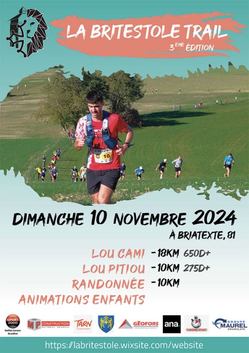 Deux associations emblématiques de la commune s’associent pour organiser une course pédestre, la BRITESTOLE. Il s’agit de deux courses natures et d’une randonnée, parcourues exclusivement sur la commune de BRIATEXTE, avec un départ et une arrivée au coeur du village. Les organisateurs ont voulu mettre à l’honneur la commune via cette manifestation sportive au travers des lieux incontournables tels que sa place du 13è siècle, ou son moulin sur les berges du Dadou. Le tracé reprenant le sentier des Crêtes situé autour du village, permet également d’admirer les paysages magnifiques aux abords de BRIATEXTE. La course nature de 16 kms permettra aux adeptes et aux novices de s’affronter sur un parcours vallonné et exigeant. La nouveauté de cette année, les organisateurs proposent un 10 kms avec 280 de D+. La randonnée de 9 kms, s’adresse quant à elle aux promeneurs désireux de profiter pleinement d’un tracé champêtre des plus agréables.