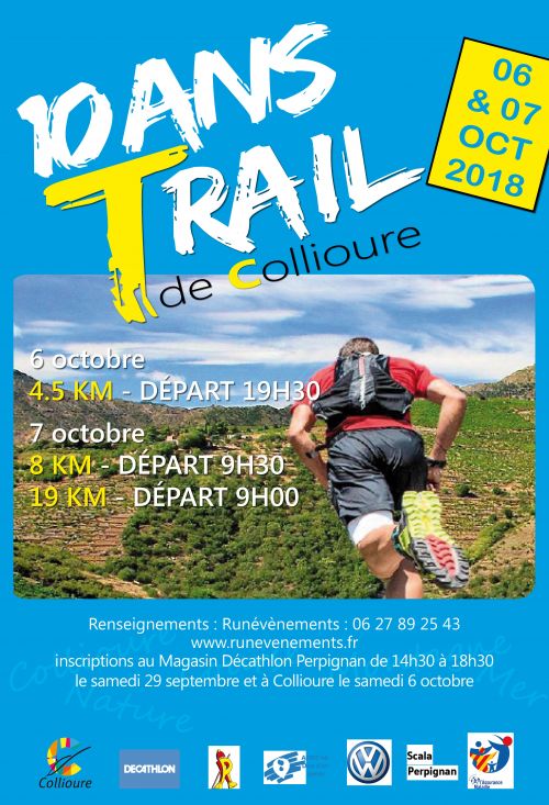 Dans le cadre de sublime du village catalan de Collioure, venez faire une randonnée de 7 kms ainsi qu’à un trail découverte de 8 kms, épreuve idéale pour découvrir les joies du nouveau sport à la mode. Pour les plus chevronnés, participez au magnifique trail de 19 kms, avec un dénivelé de l’ordre de 900m ! Et pour les 10 ans du TRAIL DE COLLIOURE, un trail nocturne de 4.5 kms dans les rues de Collioure!