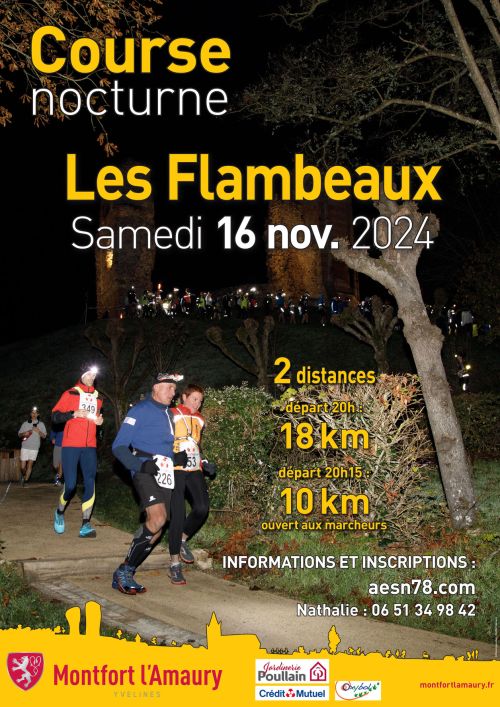 Course Nocturne Les Flambeaux. Au programme, 2 parcours, brassard fluo et lampe frontale ! A partir de 17h complexe sportif de Montfort l’Amaury, place nickenich