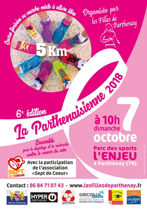 Course féminine de 5 km ouverte aux hommes déguisés en femmes, allure libre. Echauffement collectif par "Danse & Co" Marche mixte de 5 km dans le centre historique de Parthenay. Course et marche caritative en faveur du cancer du sein. les bénéfices sont donnés à la ligue contre le cancer. Echauffement course et marche Epreuve ouverte aux handicapé(e)s, Epreuve sans classement, Catégories autorisées MI->V5.