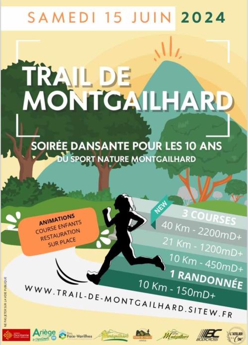 3 COURSES à l'occasion des 10 ans du Sport Nature Montgailhard 40KM D+2000M Départ 7h 21KM D+1200M Départ 8h30 Randonnée et course enfants - Restauration sur place 10KM D+450M Départ 9h30