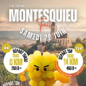 Trail de Montesquieu aura lieu dans la commune de Montesquieu (82). C’est un événement comprenant 2 courses de type trail en individuel, sur chemins, sentiers et routes.