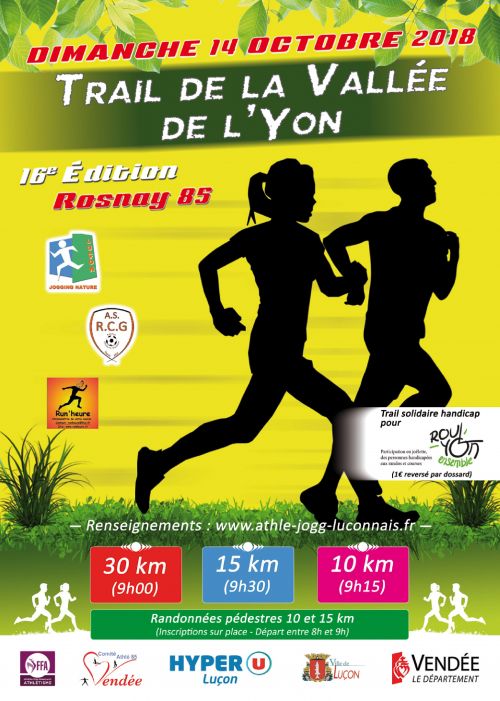 Nos parcours vous feront découvrir des sentiers, prairies, chemins, chemins creux et longer les bords de l’Yon; bref, pas de monotonie et beaux paysages, avec quelques casse-pattes quand même. Tout part et arrive au stade de Rosnay. Tous les arrivants recevront un T-shirt technique