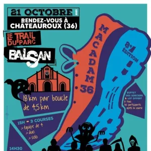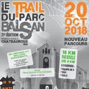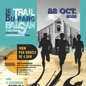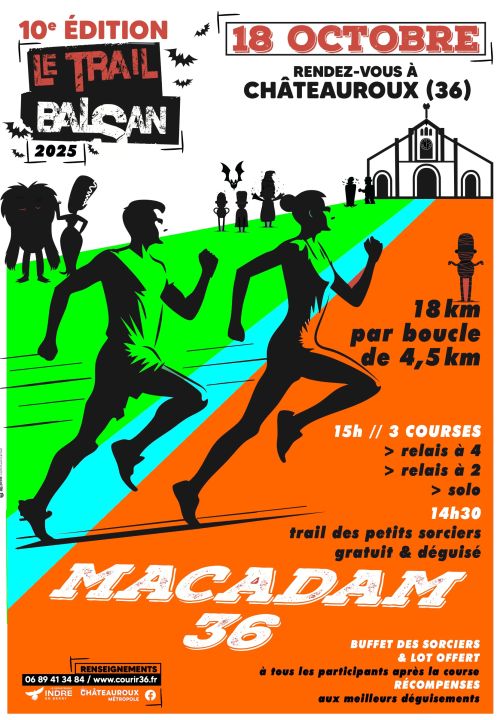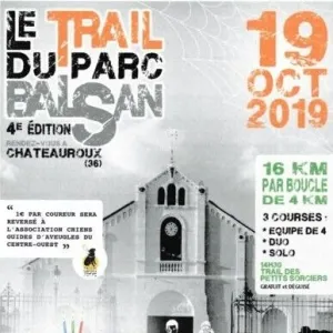 TRAIL DU PARC BALSAN DANS UN CADRE AGREABLE PARC ET VALLEE DE L INDRE PARCOURS DE 18KMS PAR BOUCLE DE 4.5KMS EN SOLO DUO OU PAR EQUIPES DE 4. DEPART A 15H POUR LES 3 COURSES DE LA SALLE DU MOULIN DE LA VALLA TRAIL DES PETITS SORCIERS ET SORCIERES GRATUIT ET DEGUISE A 14H30. BUFFET DES SORCIERS ET LOT OFFERT A TOUS LES PARTICIPANTS APRES LA COURSE. RECOMPENSE AUX MEILLEURS DEGUISEMENTS
