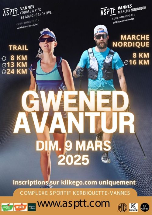 Week-end multisport avec le Gwened Trail Avantur. Dimanche, 3 trails, ainsi qu'une marche nordique. Départ et arrivée sur le complexe pour toutes les épreuves. Ravitaillement sur les circuits. Douche sur place.